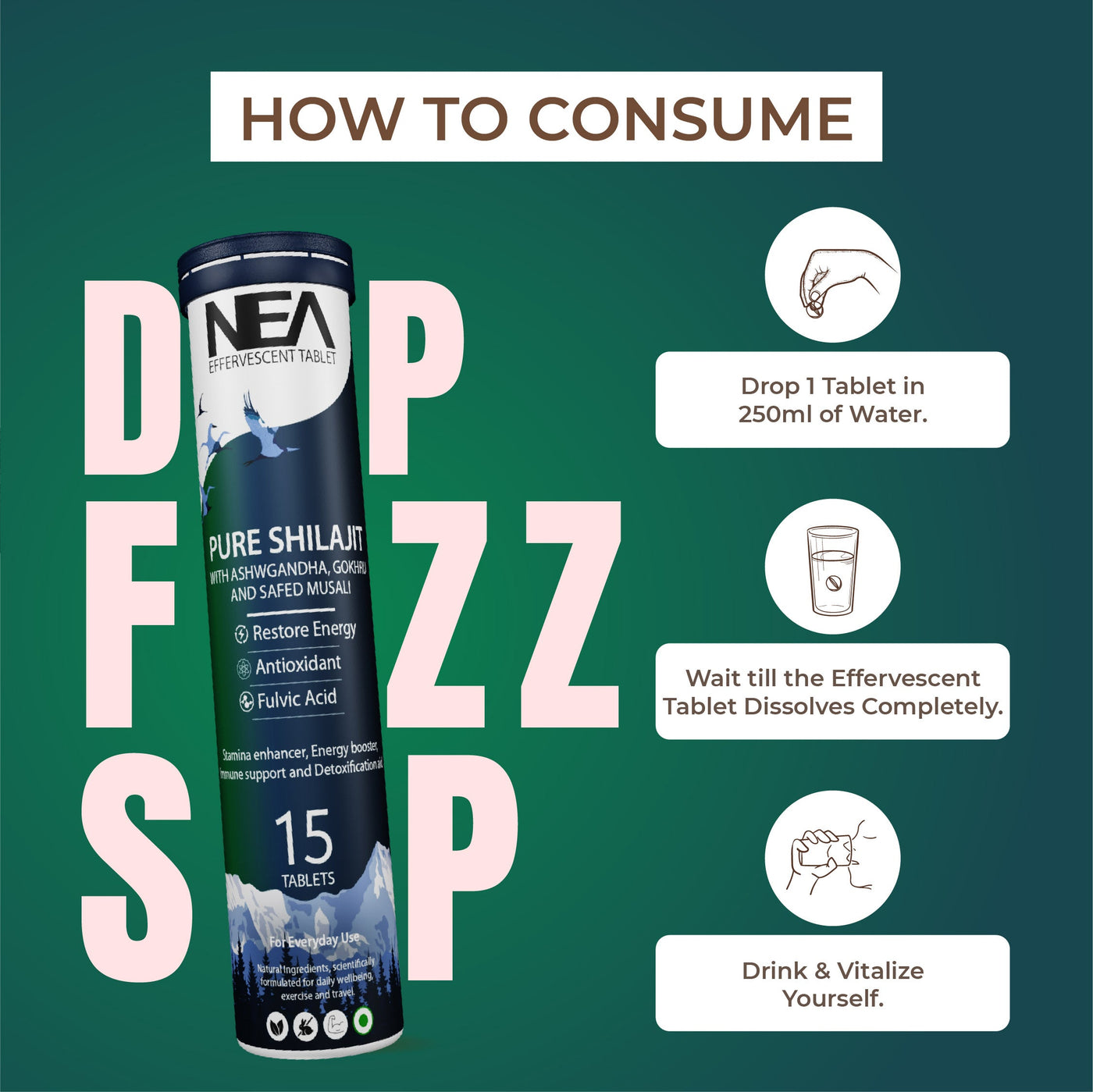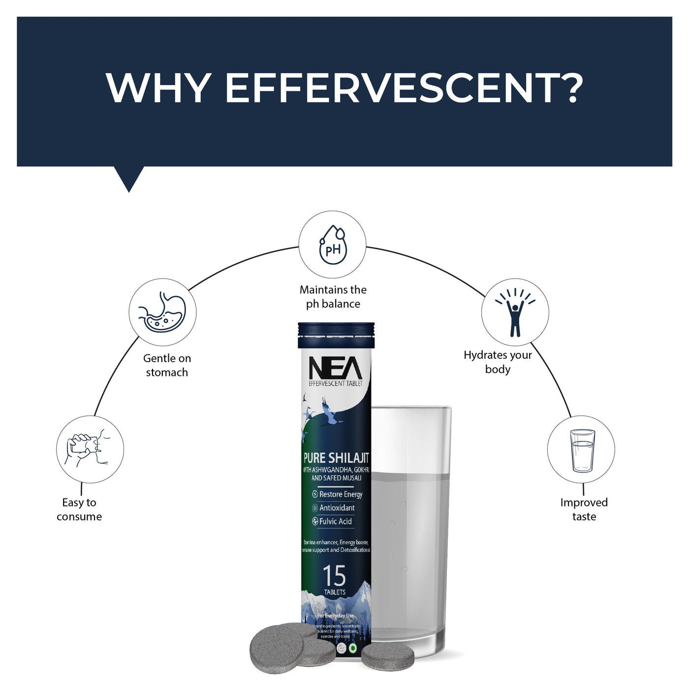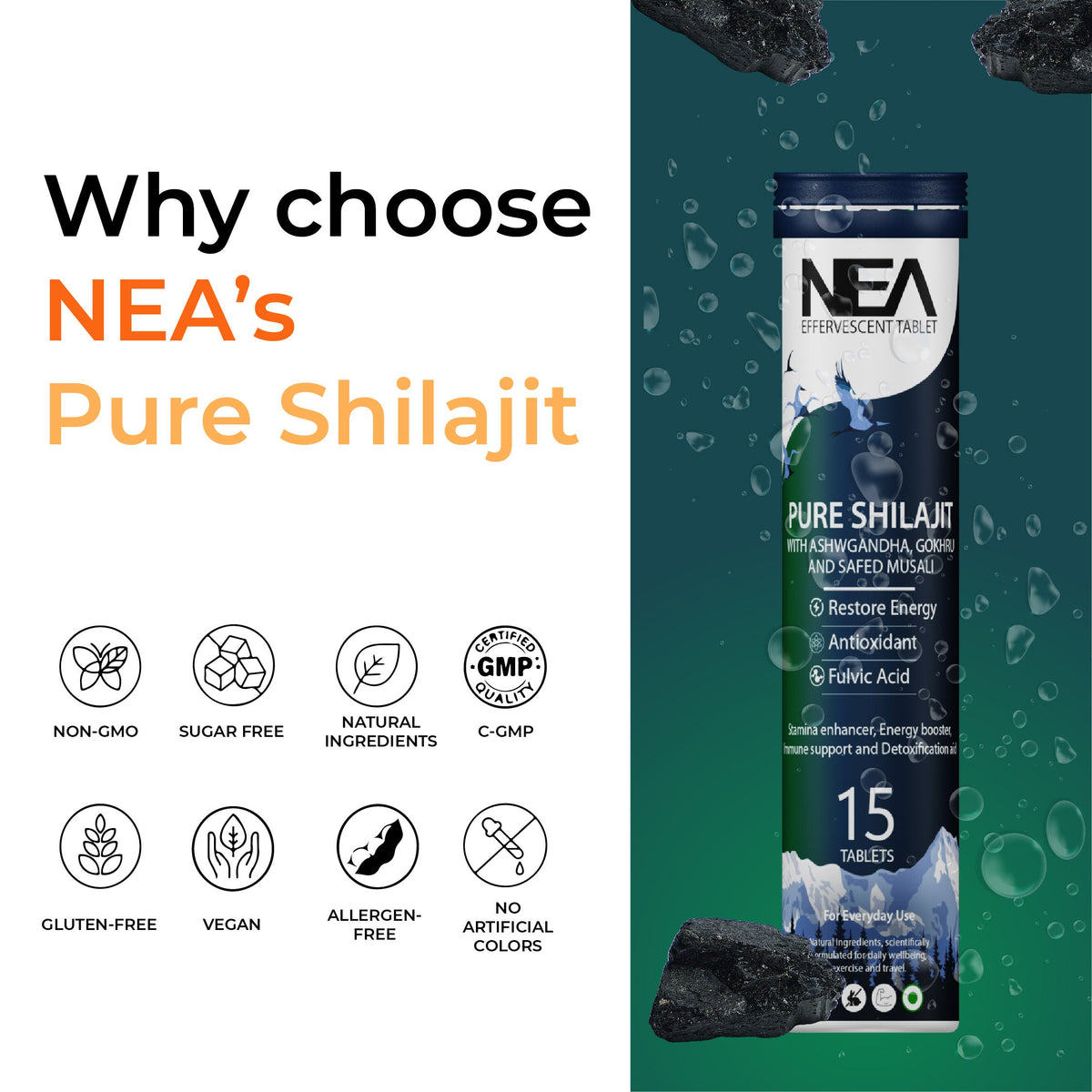 Nea Ayurvedic Himalayan Shilajit Effervescent with Ashwagandha, Safed Musli & Gokhru