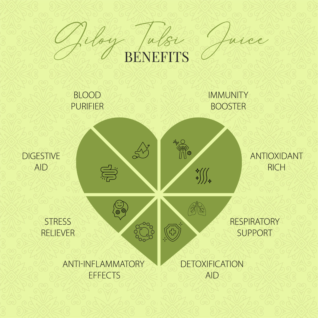 A powerful immunity booster that fights infections and seasonal allergies. Tulsi reduces stress and respiratory congestion, while Giloy detoxifies and increases endurance. Ideal for maintaining lung health, immunity, and natural body resilience.