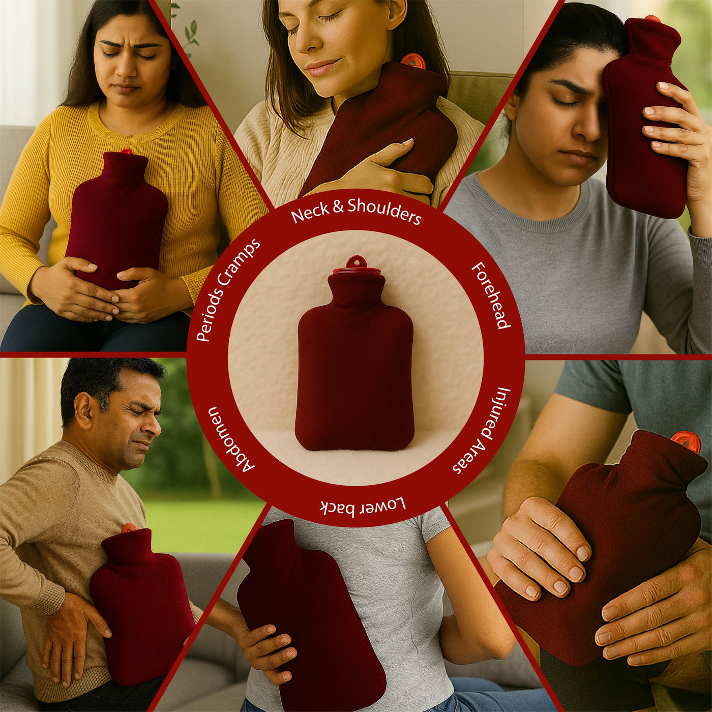 A durable, leakproof hot water bottle designed for daily relief from muscle pain, cramps, and joint stiffness. The washable velvet cover ensures gentle temperature, prevents skin burns, and provides soothing winter warmth for therapeutic comfort.